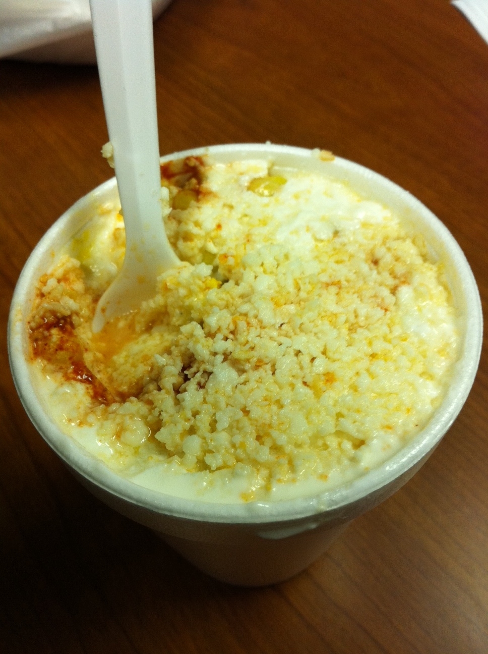 Basically Elote is corn kernels, crumbled cotija anejo cheese, cayenne pepper, mayo, chili powder, and lime juice. If you want to make your own, here is a recipe from Food Blogga.