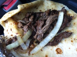 The Steak A La Mexicana is a flour tortilla filled with chunks of steak, onions, and green chili sauce. It was causing my brown paper takeout bag to leak a bit.