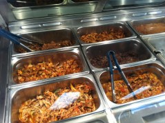 Several trays of meats rested behind a glass food service area. Out from the hidden kitchen emerged a young woman asking if I wanted something. Not exactly the friendliest of hellos and no hint of a smile. I ordered several tacos: beef, chicken, pastor (pork), and a lamb barbacoa all on corn tortillas with cilantro and onions.