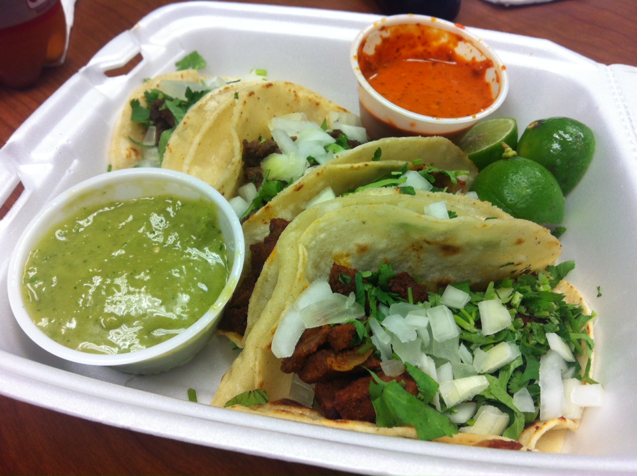 No one was in the kitchen, so I asked the mini mart cashier what’s available and was told beef and chicken fajita. A moment later a nice woman took my order and told me “no chicken.”  Okay, how about 4 beef tacos then or do you have pastor?  She shook her head yes and I ordered 2 beef and 2 pastor tacos on corn tortillas.