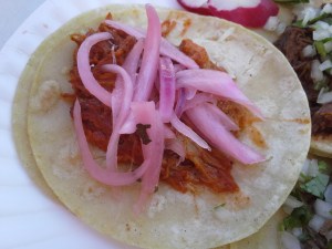 This was the first time I’ve seen a Cochinita pibil taco choice. I ordered one; though, I should’ve ordered several more. It comes with pickled red onions. I added beef and barbacoa tacos asking only for chopped onions and cilantro. Like many places they will serve the tacos with a guacamole sauce and shredded cheese.