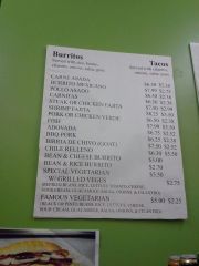 There are 14 choices for your taco here – everything from the traditional carne asada, carnitas, and chicken to a few vegetarian choices including avocado, grilled vegetables, or their “Famous Vegetarian.”   There are also chile relleno and seafood tacos.